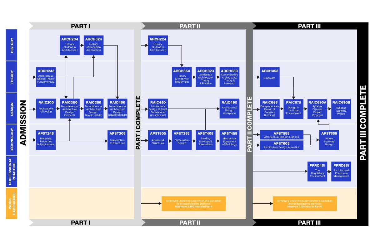 Unlike the sequential University route of theoretical education followed by work experience through the Intern Architect Program, the RAIC Syllabus Professional Diploma Program of Studies is comprised of 3 concurrent components described briefly below and detailed in the Curriculum Sequence Chart and Course Calendar. The 28 courses of the RAIC Syllabus Professional Diploma Program of Studies have been numbered and grouped into a planned learning path with emphasis on the integration of design studio workshops, academic courses, and work experience.